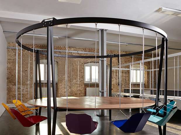 Uma empresa britânica desenvolveu uma mesa que tem cadeiras de balanço ao seu redor....